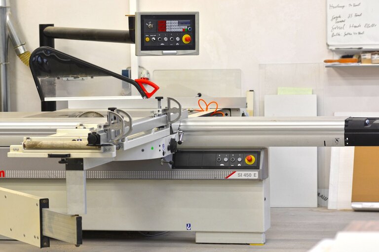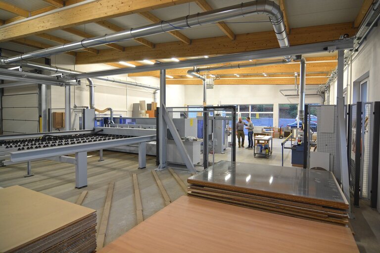 In den letzten Jahren haben wir ca. 3 Mio. Euro in die Produktion investiert. Somit ist die Fertigung hochmodern und effizient vernetzt. Jedes Teil hat seine Nummer und Aufgabe. Für die gefertigten Produkte existieren nur sehr kurze Lagerzeiten, da nicht lange im Voraus vorproduziert werden muss. Die Maschinen kommunizieren untereinander und arbeiten flüssig mit unseren Produkten. Somit können wir Bestellzeiten von fertigen Schränken, Zimmern oder Büros in 48 Stunden zu niedrigsten Produktionskosten gewährleisten.