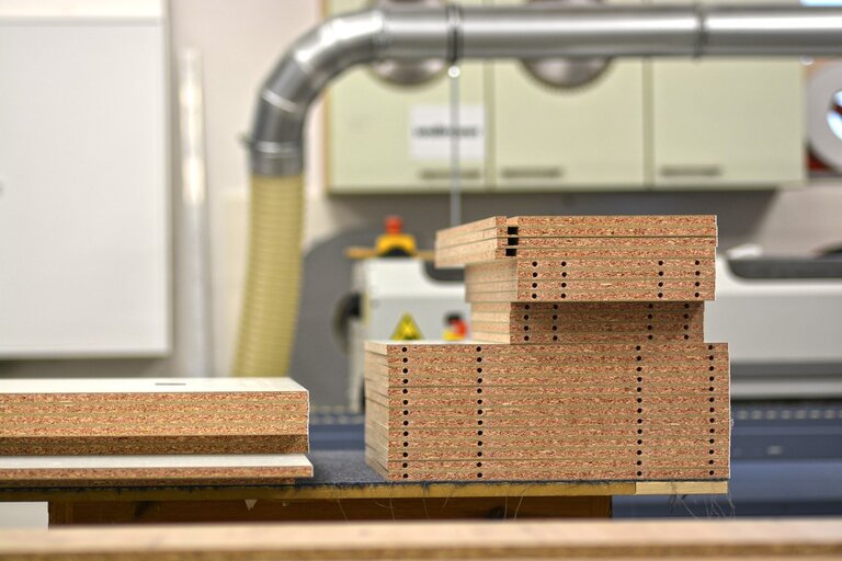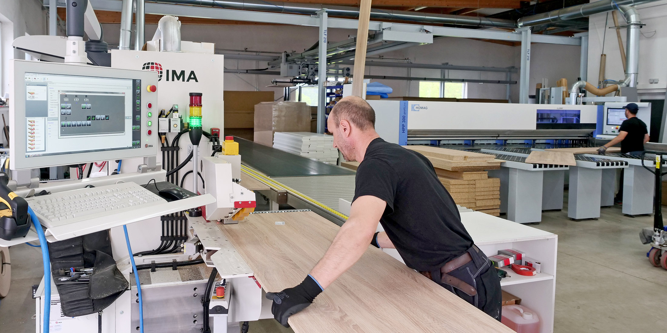 Aktuell besitzen wir ca. 3465m² Plattenmaterial am Lager in 80 verschiedenen Dekoren, Oberflächen, Holzsorten und Plattenstärken. Die Gesamtheit des Plattenmaterials ist zu jeder Zeit verarbeitungsbereit. Das automatische Lager empfängt Daten aus dem Büro z.B. von Teilen die produziert werden müssen. Das Lager optimiert dazu genau den Verschnitt und auch die Verarbeitung von Restern. Danach schickt das Lager das Material automatisch zum Zuschnitt. Dieser erfolgt ebenfalls automatisch. Beim Zuschnitt wird jedes Teil automatisch etikettiert, um dem Bauteil die nötigen Informationen zu geben. Das Etikett beschreibt, um welches Teil es sich handelt und wie es weiterverarbeitet werden soll. Teile werden nach dem Zuschnitt mit einer Schmalflächenverklebung versehen. Der Bediener scannt dazu das nötige Teil ein und die Maschine startet dazu die dafür bestimmte Bearbeitung. Teile die noch Fräsungen, Formgebung oder Bohrungen benötigen werden auch von einer CNC Maschine gescannt und im Durchlauf bearbeitet. Fertigteile werden entweder zerlegt, ausgeliefert oder auf der Montagelinie zusammengebaut und verpackt.